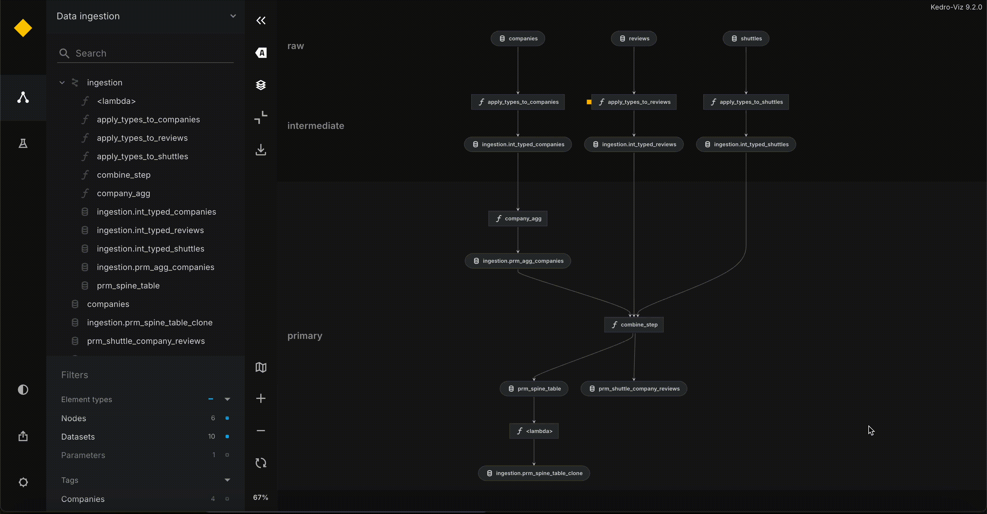 - Visually through Kedro-Viz: This approach allows you to visually choose and slice pipeline nodes, which then generates a run command for executing the slice within your Kedro project. Detailed steps on how to achieve this are available in the Kedro-Viz documentation: Slice a Pipeline.